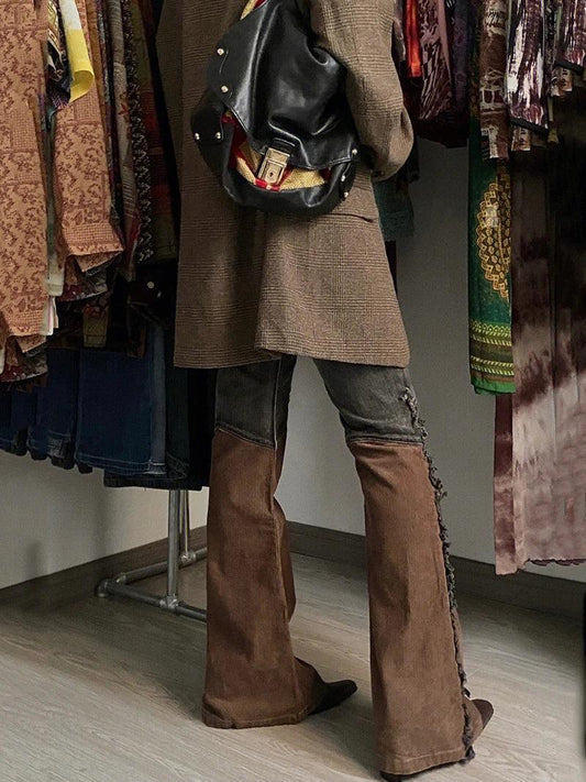 Vintage Country Chic Hipster Flared Jeans Patchwork Wide Pants with Side Tassels High Rise