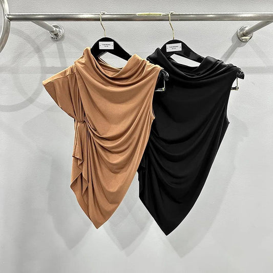 Asymmetrical Pleated Cropped High Neck Micro Elastic One Shoulder Knitted Top